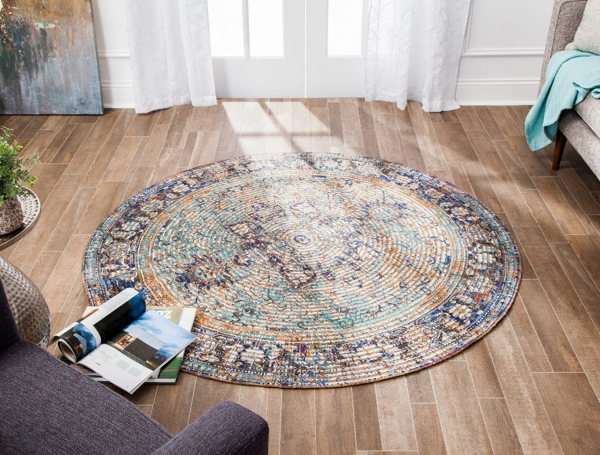 This distressed, Persian-style rug features a jute-forward texture that's rustic, rugged, and raw. Garden motifs and lotus flowers in muted jewel tones of turquoise, sapphire, and citrine will add classic beauty and a well-worn warmth to any room in your home. Trust this handwoven rug to heavily trafficked rooms like your entryway, living room, dining area, or playroom and you won't be disappointed in its functional floor protection and lasting appeal.