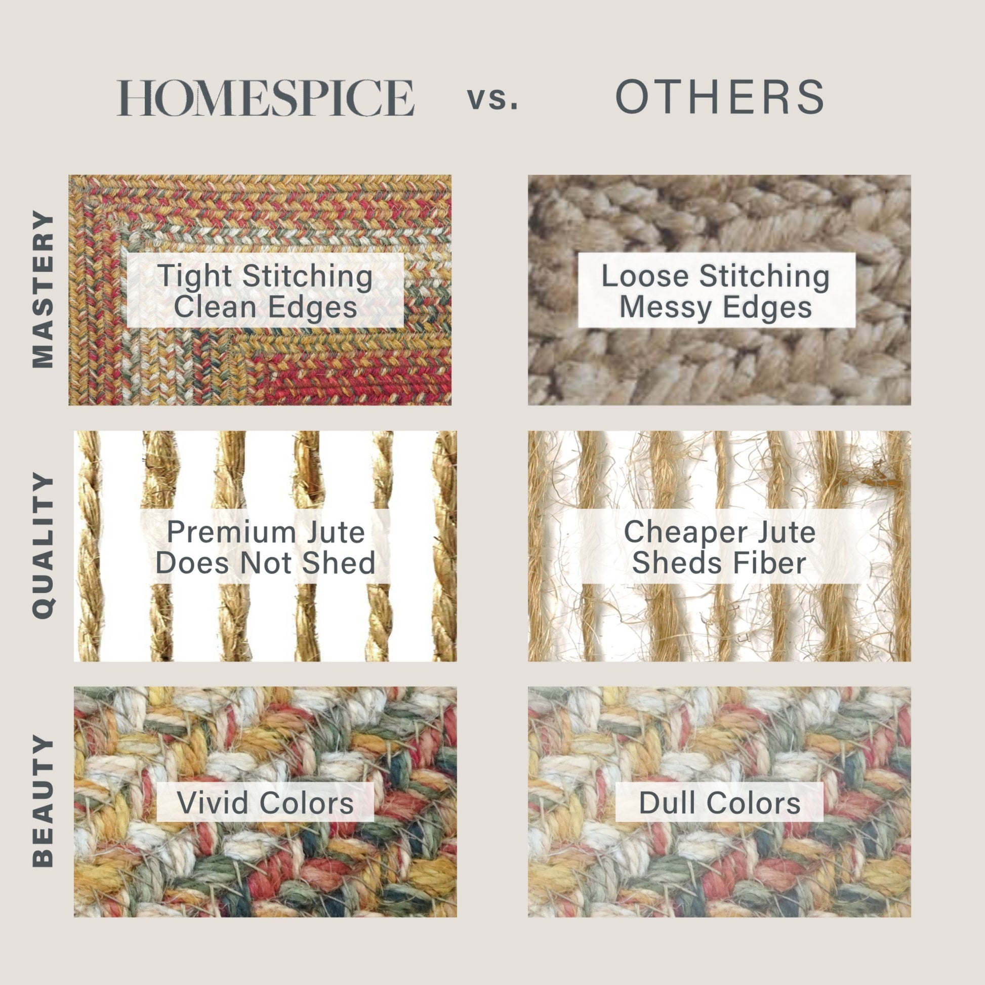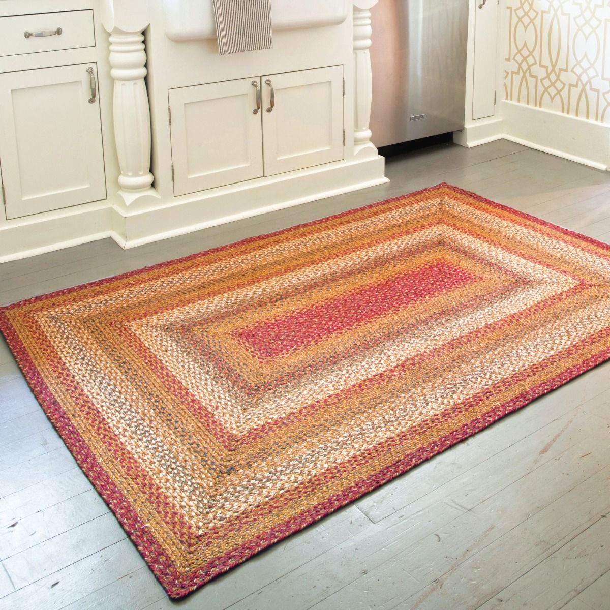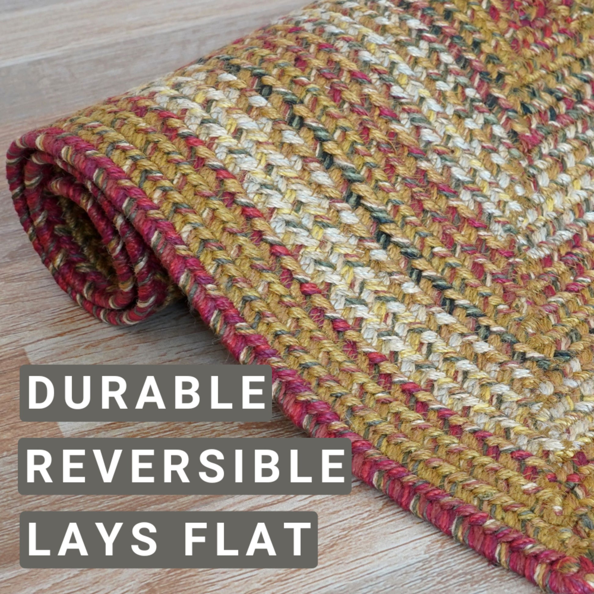 Golden tones of mustard with red is set off with green accents. There is a place for Homespice Decor Jute braided rugs in almost every home.�Dress them up or go casual. Make them the center piece of a room or an eye catching accent. Made of natural fiber, our Jute rugs are soft, durable and affordable. Available in rich earth tones and vibrant hues, they provide a warm, inviting atmosphere that stresses the importance of an eco-friendly environment.