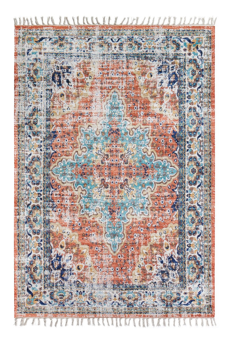 The unbelievable softness of this handwoven rug is the first thing that will strike you when you unroll it. The second thing will be how the brilliant color of its Persian pattern is beautifully balanced by a distressed treatment. The softness derives from the polyester blend of this rug's rag weft, which imparts a cushiony feel underfoot that will feel great in an office, living room, or bedroom. This rug's blend of global style and lived-in comfort will give your space just the casual style update you've been shopping for.